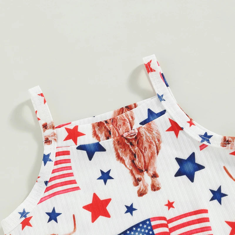 - Sleeveless Off-Shoulder Vest Top: Designed for effortless dressing, this pullover style top is adorned with an adorable flag and bull print, making it a fashionable choice for every outing.