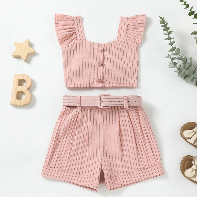 Lioraitiin Toddler Girl Summer Outfits Stripe Print Flutter Sleeve Tank Tops and Belted Shorts 2 Piece Set
