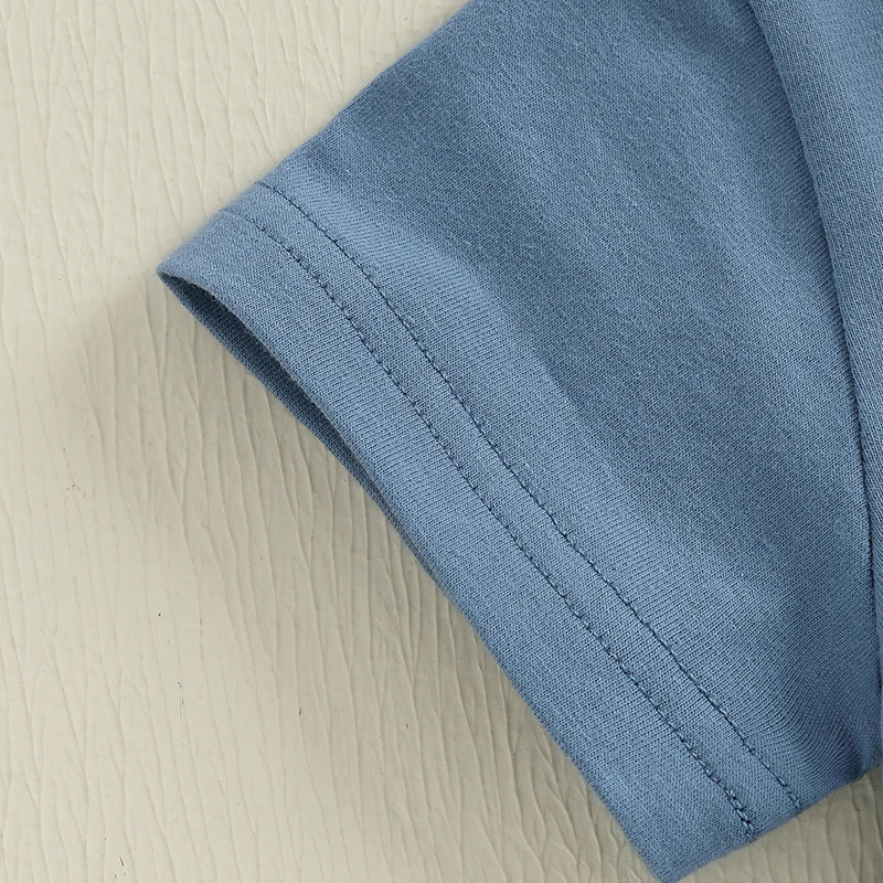 Crafted from a high-quality blend of 95% cotton and 5% elastane, this outfit ensures softness against your baby's delicate skin while providing the flexibility for endless playtime. The short-sleeve T-shirt showcases an adorable letter patch embroidery, adding a playful touch that enhances its appeal.