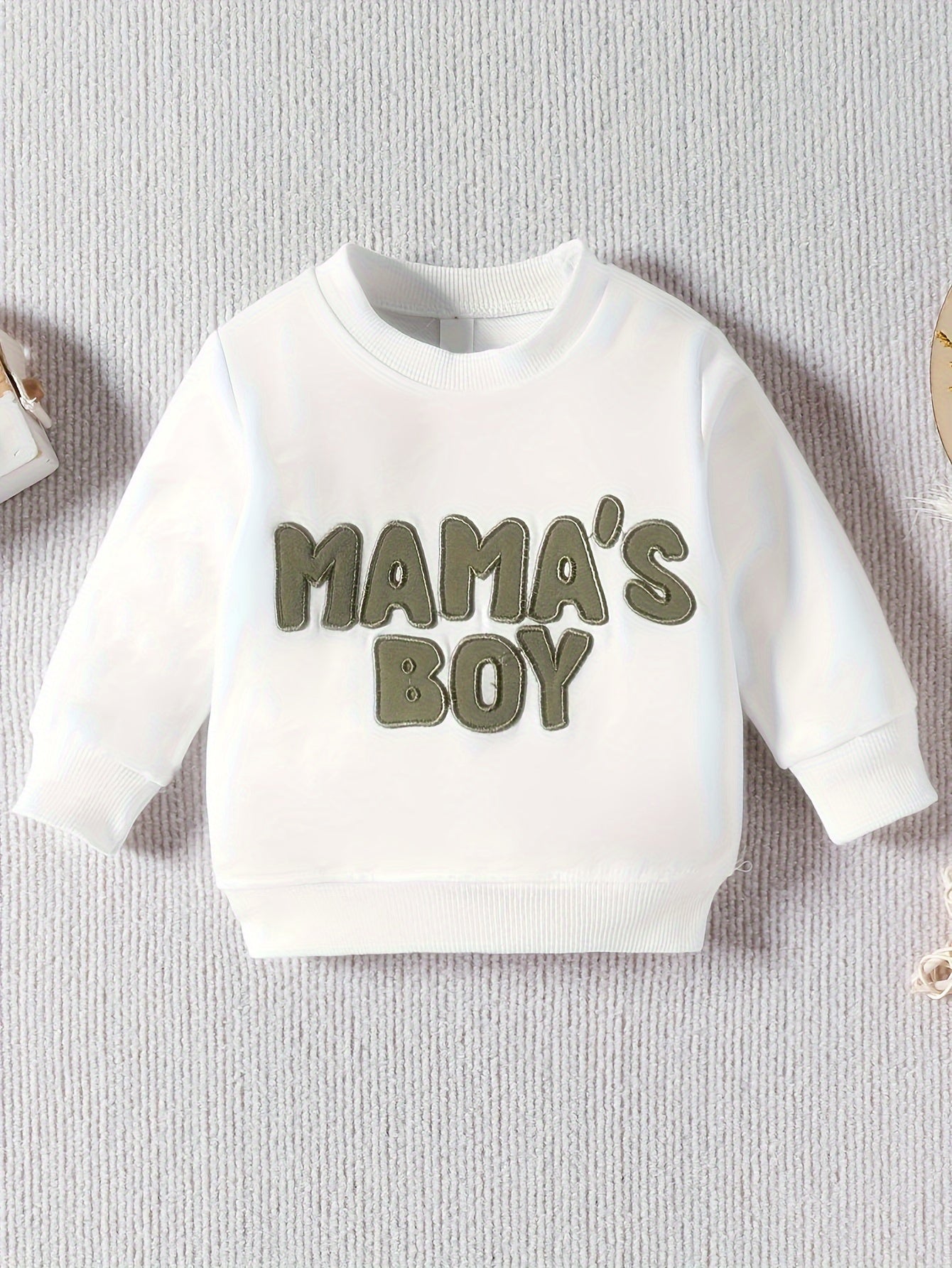 Crafted from a soft blend of 95% cotton and 5% polyester, this set features a crew neck sweatshirt and matching trousers, offering a slight stretch for additional comfort. The long sleeves provide warmth, while the playful "Mama's Boy" print makes a charming statement that every parent will love.