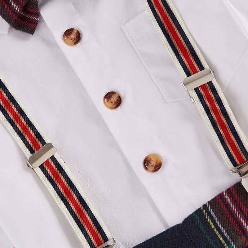 Add this delightful Toddler Boy Formal Wear Stylish Long Sleeve Shirt with Bowtie and Plaid Suspender Pants 2 Piece Set to your cart today, and let your little one shine on their special day!